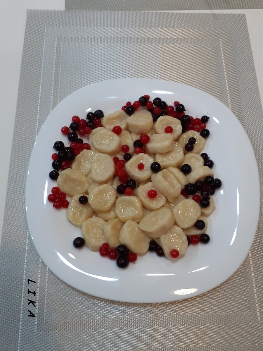 Утром выходного дня так хочется побаловать своих родных чем-то вкусненьким. Реализовать такое желание особенно легко летом, когда на прилавках магазинов и рынков продается множество различных свежих ягод и фруктов. Даже если блюдо только украшено ягодами, оно становится гораздо красивее и аппетитнее. Ленивые вареники-одно из них. Для приготовления порции на 2-х человек потребуется: -200г.творога. Я использую творог ТМ «Простоквашино». -2 столовых ложки муки -2 столовых ложки манки -1 яйцо -2 столовых ложки сахара -200 грамм черной и красной смородины или других ягод Время приготовления 35 минут. Приготовление: Творог соединить с яйцом, добавить муку, манку, сахар, хорошо вымесить и замесить тесто. Раскатать из него колбаску и порезать на кусочки. Поставить на плиту кастрюлю с водой. Когда закипит, посолить и опустить вареники, варить 5 минут. Смородину слегка размять вилкой, посыпать сахаром и выложить сверху на готовое блюдо в каждую порцию.