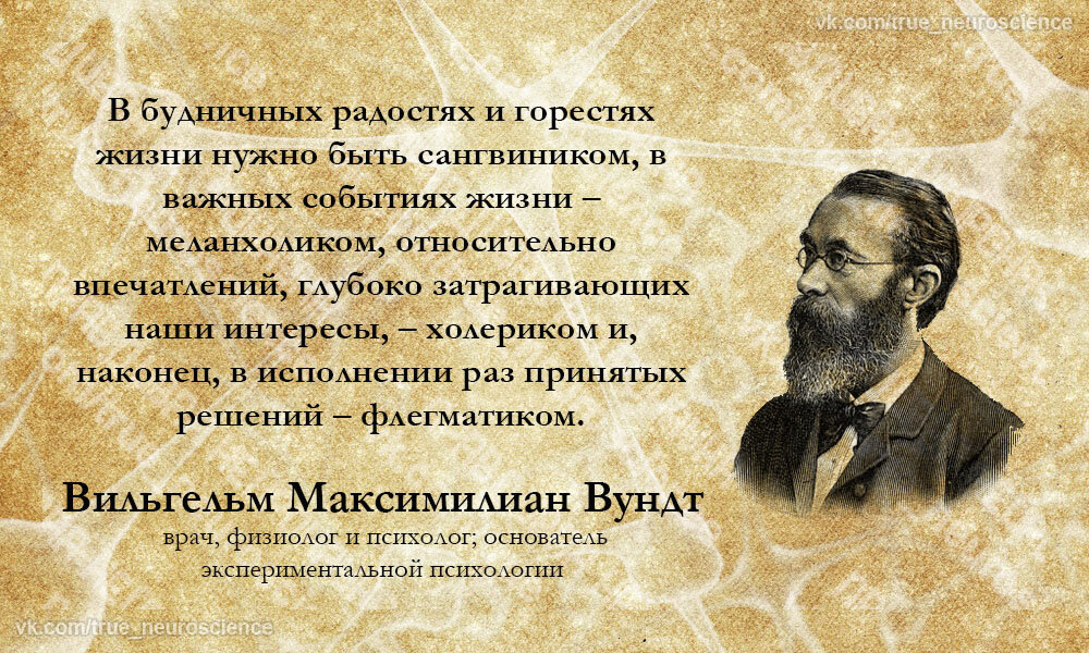 Вильгельм Максимилиан Вундт, врач, физиолог, психолог, основатель экспериментальной психологии: "В будничных радостях и горестях жизни нужно быть сангвиником, в важных событиях жизни – меланхоликом, относительно впечатлений, глубоко затрагивающих наши интересы, – холериком и, наконец, в исполнении раз принятых решений – флегматиком." Гибкость поведения применительно к различных жизненным ситуациям – залог сохранения высокого уровня психического здоровья.
