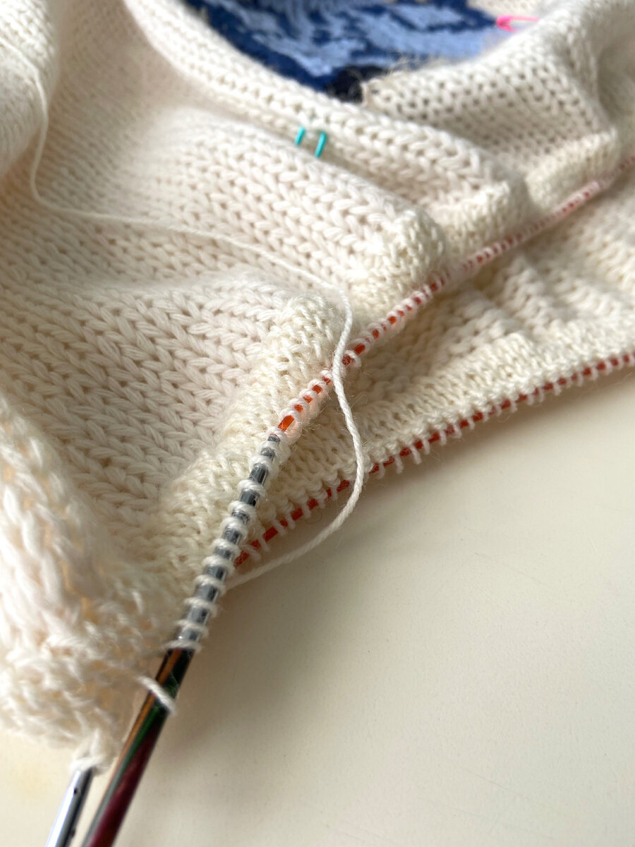 Часть 3 Что ж, я пообещала себе ничего не докупать для этого свитера, а не вышло! Пряжи хватило на полочку, спинку, часть планок, для некоторых распустила образцы. И все. На рукава пришлось подбирать вариант, перебрала уже четыре, пока все не то… Пробовала другого цвета, полосатые, даже из этой плюшевой пряжи. Пока алгоритм такой: вяжу, примеряю, распускаю. Пока решаю что с рукавами, допишу тут процесс. И покажу как я обрабатываю наборный край и горловину. Спинка Все как для полочки, только набрала 98 п. и от проймы до скоса плеча на 3 ряда короче, чем полочка. А все потому что грудь. Я вытачек по полочке не делала, кстати, но при желании можно. Рукава Петли подниму из проймы, со стороны полочки 31 п., со стороны спинки 28 п. Итого 59 п. Вязать буду 65 р. Убавки сделаю в каждом 20-м р. (3 раза по 2 п.) Валик, имитирующий кетлевку, сделаю хитрым способом: перейду на спицы 4, свяжу 3 р. лиц. глади, в следующем ряду буду поднимать петлю из первого ряда (с изнанки) и провязывать вместе с