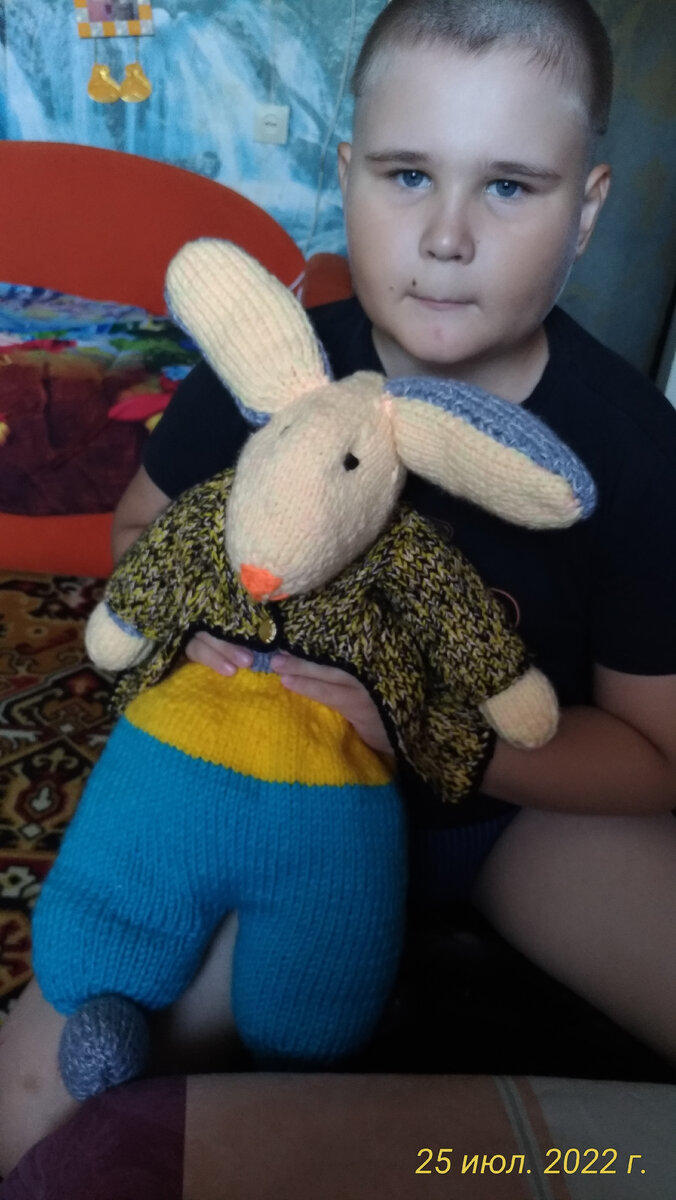 Я неисчезла и непокинула вас! Просто нахожусь в отпуске но хобби всегда при мне. И вот сын читал книгу французкой писательницы,,Дейк Камилла ,,Приключение Кролика Эдвврда,,. Вот вязала этого кролика по мастер классу Татьяны Яковлевой но истественно что косвенно по расчетам а размер и цвет свой выбрала,но удачно и спасибо ей за проект.