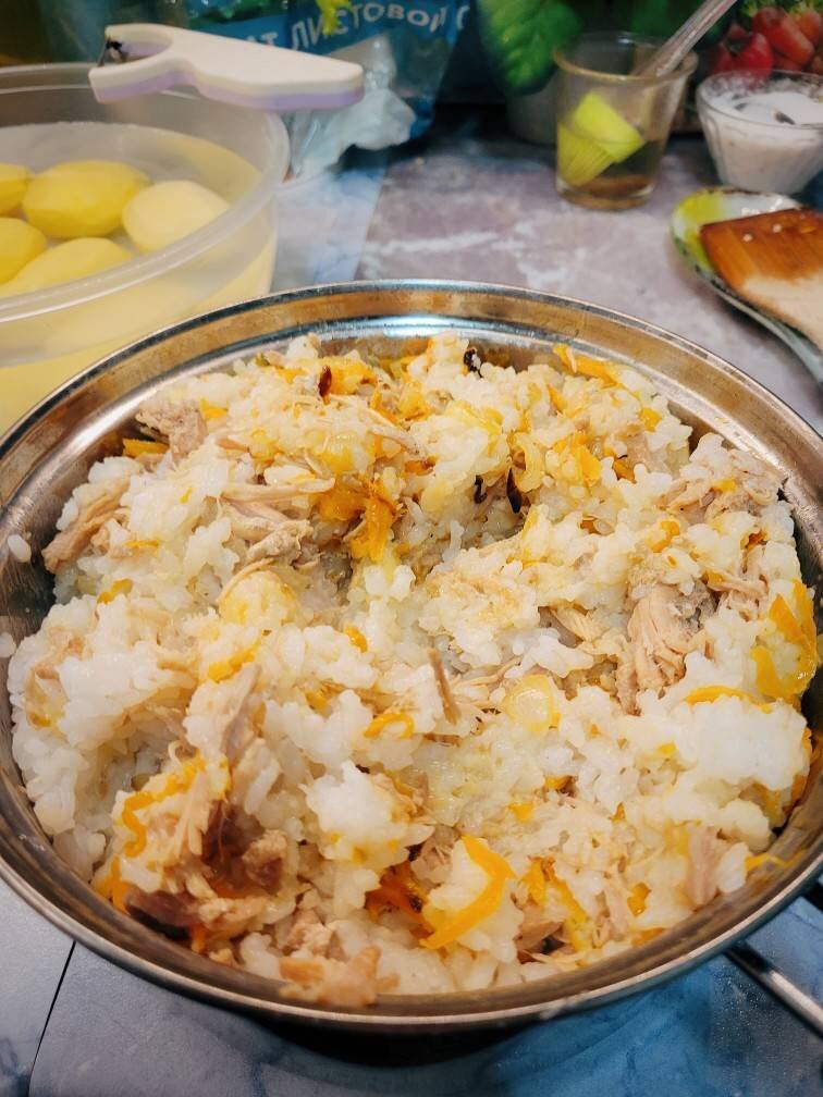 Ингредиенты: Морковь, Лук, Рис , Вода, Тушенки (у меня свинина), Соль, специи Способ приготовления: Отварить рис до готовности. Если варите рис в кастрюле: Промыть тщательно рис. Всыпать в кастрюлю с водой. Посолить (у меня 3 ч.л) Вода 4 ст, рис 2 ст (пропорция 2:1). Варить на медленном огне столько, сколько указано на упаковке. У меня круглозёрный обычный, варила 20-25 мин под крышкой до готовности. Крышку не открывать. Тушенку потушить. Вместе с жиром на сковородку. До сухарей готовить не нужно. Сделать зажарку. Морковь на крупной терке, лук мелко нарезать. Вместе с маслом потушить на сковороде на мелком/среднем огне. Я сначала делаю на мелком под закрытой крышкой, потом немного добавляю. До чёрного цвета, естественно, не надо. Все вместе перемешать: рис + тушенка + зажарка. Готово!