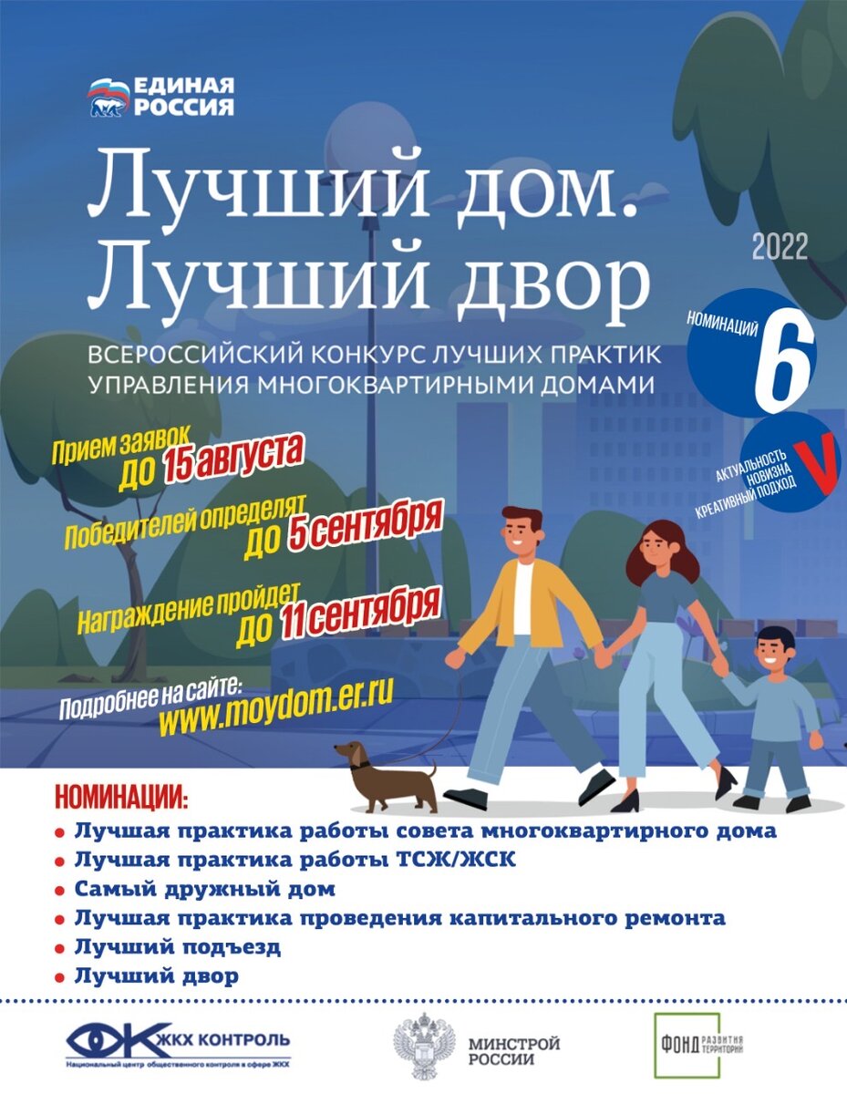 Уважаемые оренбуржцы! Приглашаем вас принять участие во Всероссийском конкурсе лучших практик управления многоквартирными домами «Лучший дом. Лучший двор». Всем известна ставшая крылатой фраза из советского фильма «Управдом — друг человека». В нашем родном Оренбуржье, как и в других регионах страны, есть немало примеров того, как собственники совместно с профессиональными управляющими компаниями сделали свои многоквартирники «домами образцового содержания». Мы ищем самых талантливых из них и покажем всем лучшие примеры реализации проектов по совершенствованию процесса управления многоквартирными домами. Вы можете подать заявку до 15 августа на любую из 6 номинаций. Подробнее на сайте https://moydom.er.ru/