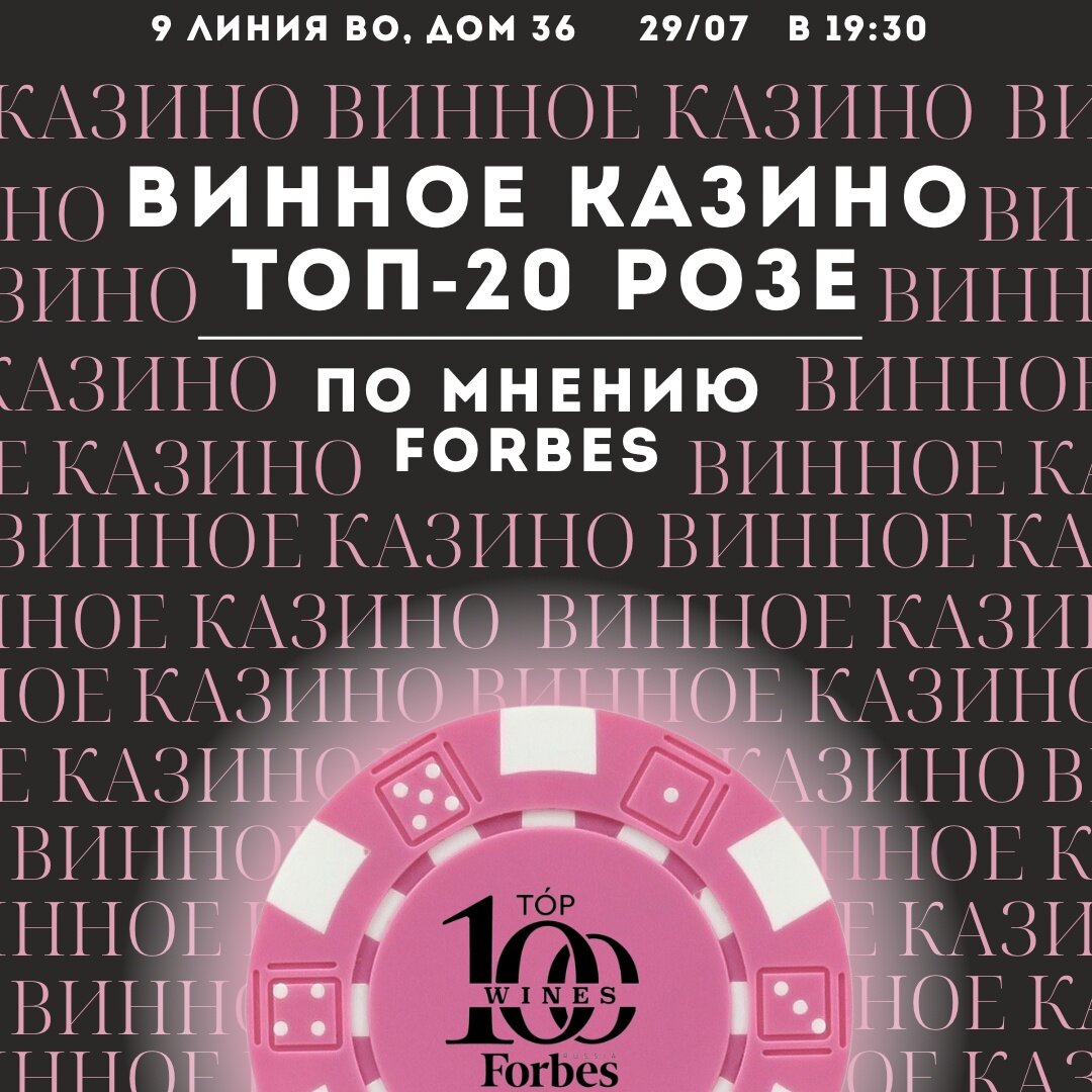 #Виноскоп_события_июль_2022 #Виноскоп_дегустации Дегустация в формате Винного Казино по Розе из списка TOP20RoseForbes.🍷🍷🍷 В эту пятницу, 29 июля, приглашаем вас, друзья, на Казино по российским Розовым винам, попавшим в TOP20 по версии Forbes Россия! Рейтинг вышел в начале лета 2022 года! В начале лета был составлен следующий рейтинг российских но уже только вин, организованного этим известным изданием в нашей стране. Высококвалифицированные и признанные специалисты — международные и российские винные эксперты и консультанты, сомелье и винные академики оценивали образцы по качеству и не только. При определении итогов учитывались потребительская доступность, узнаваемость бренда, маркетинговая активность, репутация и известность производителя и другие факторы, важные для продвижения отечественного вина в России. Не будем загружать вас лонгридами, где «много букв», а порекомендуем прийти на дегустацию в винотеку «Русское Вино» на В.О. рядом с метро Василеостровская. А там расскажем