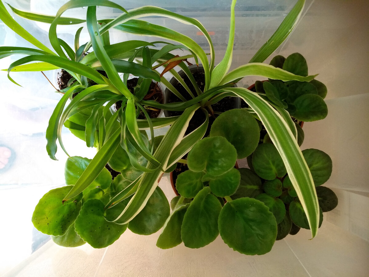 Еще не надоели мои перечисления растений? Всю серию статей положила в подборку "Перекличка" Следующие два кусочка моей растительности. В первом - хлорофитум зеленый (48) и с белой полосой (49). Никогда не задумывалась об их сортах. Это детки, со временем заменят материнские растения. Ну и тут несколько несортовых фиалок. Простенькая компания. Второй маленький контейнер поинтереснее. Слева не так давно купленная маранта Maranta Leuconeura Variegata (50). Под ней спрятался один из адениумов. Справа - бегония Тигр (51) или как-то так. Мечта из детства. Смотрела на закрученные мохнатые стволы и думала что бы незаметно от неё отковырять, чтоб себе посадить. Жаль, что тогда мне некому было подсказать, что всего-то нужен один лист. Собственно, она у меня и выращена из листа. Справа внизу полосатые листья - драгоценная орхидея Лудизия (52). Не идёт у меня с ними, похоже что требуют более внимательного подхода. Или хотя бы более равномерного. 52, продолжаем...