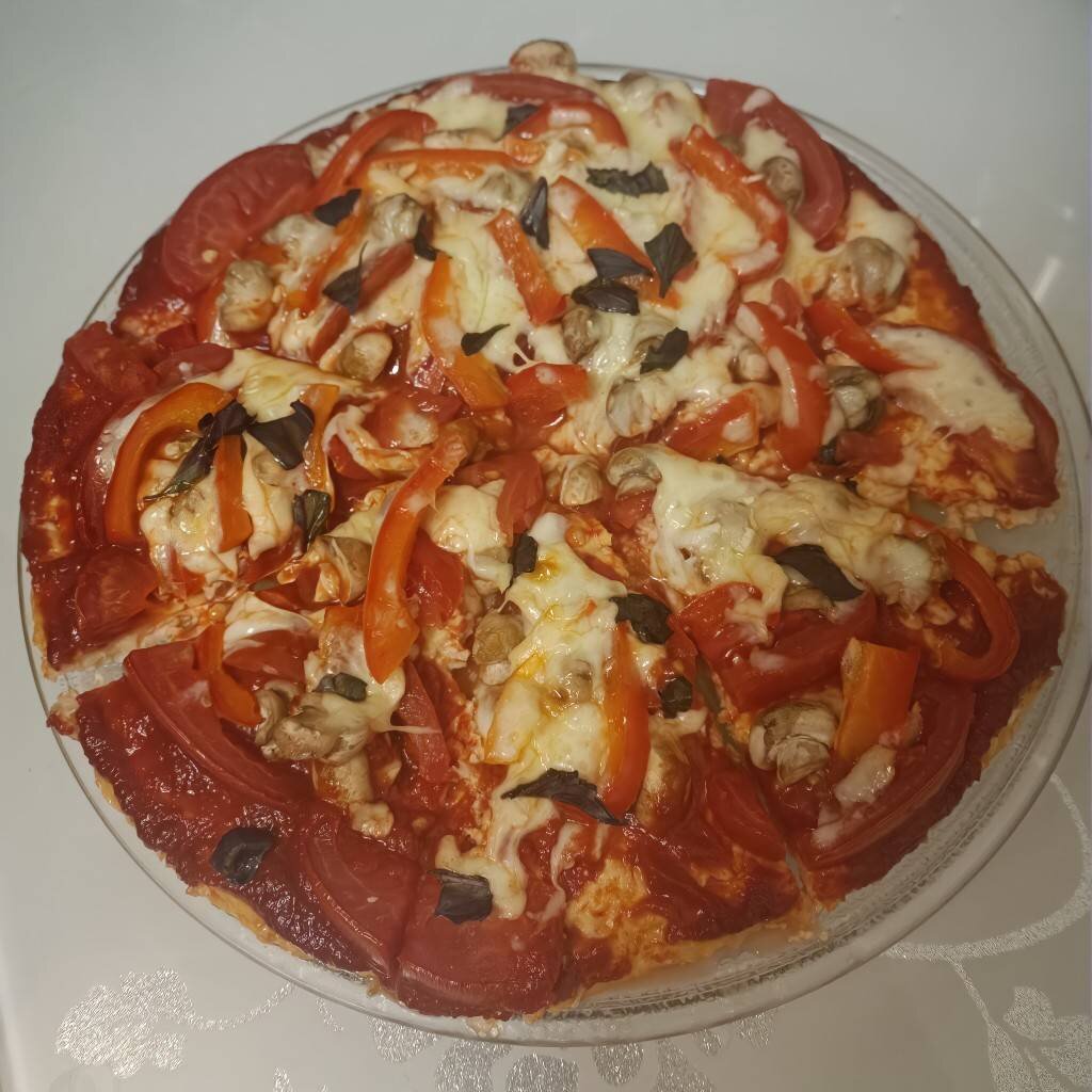 #июль Ингредиенты: "Тесто":, Моцарелла , Цветная капуста , Яйцо куриное, Начинка:, Томатная паста , Моцарелла , Помидор, Перец болгарский, Шампиньоны, Базилик Способ приготовления: Натереть сыр моцарелла и цветную капусту на тёрке 🧀🥦 Добавить к ним два яйца и хорошенько перемешать 🥣 Застелить противень пергаментом и распределить по нему получившееся "тесто" тонким слоем 🤏 Запекать в разогретой до 230° духовке 15-20 минут так, чтобы у вас получился корж - основа пиццы 🍕 Достать корж из духовки и смазать его томатной пастой (пасту я развожу горячей водой; на 3 столовых ложки примерно 100 мл воды) 🥄 Нарезать помидоры, перец, шампиньоны и распределить на коже поверх томатной пасты 🍅🫑 Оставшийся сыр натереть и распределить на корж сверху 🧀 Запекать при температуре 230° в духовке 10-15 минут 🕑 За две минуты до готовности выложить сверху базилик 🥬