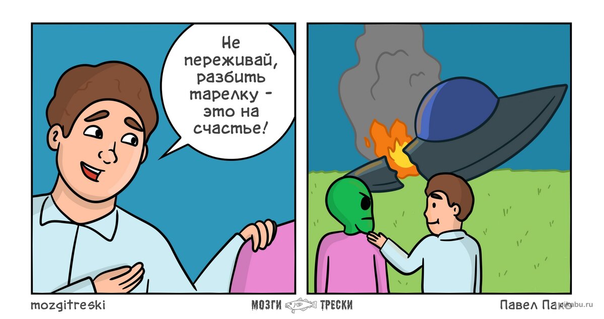 Привет, дорогой друг! Я очень своеобразно отношусь к приметам и суевериям: если мне встречается примета, которая сулит удачу, я в нее верю. Если же мне перебежал дорогу черный кот, что говорит о возможных неудачах, я в мгновение становлюсь скептиком. Хотя есть одна примета, в которую я верю всегда — если тебе попалась статья с моего канала, то ты точно улыбнешься. В каждом материале здесь есть #юмор и все статьи призваны поднимать настроение. Сегодня, например, я подготовил #комиксы , которые посвящены различным народным приметам и суевериям. Мне кажется, что примета про осколки посуды люди придумали для того, чтобы не так сильно расстраиваться, если что-то разбилось. К тому же разбитая чашка или чайник действительно не такая уж и серьезная проблема. А вот если речь о тарелке из комикса Павла Пако, то даже будущее счастье не перекроет ощущение утраты. Мне всегда было интересно, как в случае чего доказывать контролерам на автобусном маршруте, что ты вовсе не заяц, а счастливчик, который