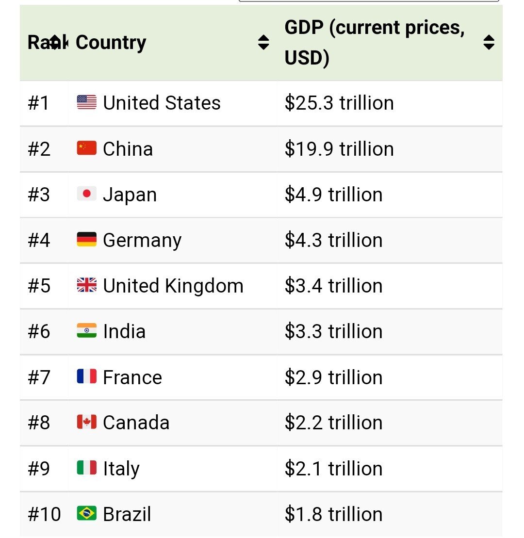 США и Китай серьезно так отрываются от всех. Россия на 11 месте с ВВП $1.8 триллионов. Вроде бы так же как у Бразилии, но на 11 месте. К слову так думают сервис Visual Capitalist. А по нашей оценке ВВП России $2.1 триллиона. Так что мы точно в 10ке 👉 Больше полезных статей у меня в Кубышке