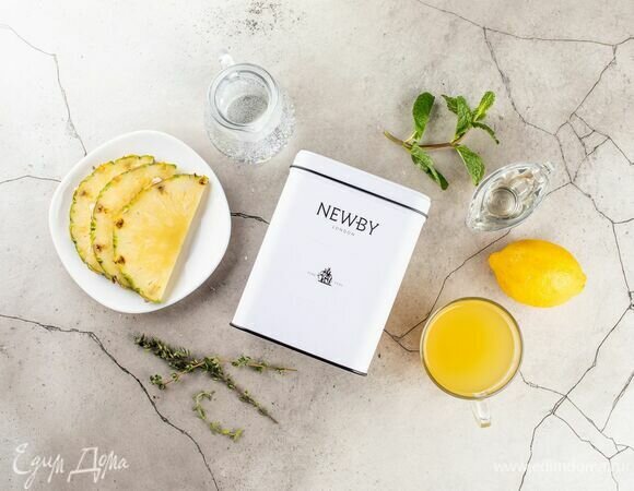 Приготовьте сахарный сироп. Соедините в сотейнике 100 мл воды и 50 г сахара. Доведите до кипения, дождитесь полного растворения сахара и остудите. Шаг: 2 В заварочный чайник насыпьте чай Newby «Кхус Гарден». Шаг: 3 Добавьте веточки тимьяна и мяту. Шаг: 4 Залейте свежекипяченой водой 90°С и оставьте настаиваться на 5–7 минут. Шаг: 5 В кувшин выложите лед, дольки лимона и ананаса, влейте ананасовый сок и сахарный сироп. Шаг: 6 Чай остудите и перелейте в кувшин. Шаг: 7 Разлейте по бокалам, украсьте дольками ананаса и листиками мяты.