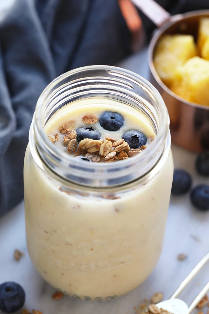 Если вы ищите полезные, вкусные и свежие рецепты для себя и своей семьи - начните с нашего прямо сейчас! Этот смузи является диетическим, так как и ананас и имбирь способствуют жиросжиганию, но несмотря на это, благодаря молотым семенам льна, замороженному банану и греческому йогурту, напиток хорошо насыщает и избавляет от чувства голода. Также наш витаминный густой коктейль способствует повышению иммунитета и улучшению общего состояния организма. В нем идеально сочетаются сладкие и пряные вкусы. Такой смузи может стать прекрасным завтраком или сытным напитком вместо перекуса. Ингредиенты: замороженные кусочки ананаса : 1 стакан измельченные семена льна или льняная мука : 1 ч.л. очищенный и замороженный банан : половинка греческий йогурт : 1/4 стакана (обезжиренный, без ароматизаторов) свежий имбирь: 2 ч.л. тертого (или больше) апельсиновый сок : 1 стакан Способ приготовления: 1. Поместите все ингредиенты в высокоскоростной блендер. Измельчите до однородной массы. 2. Подавайте сразу