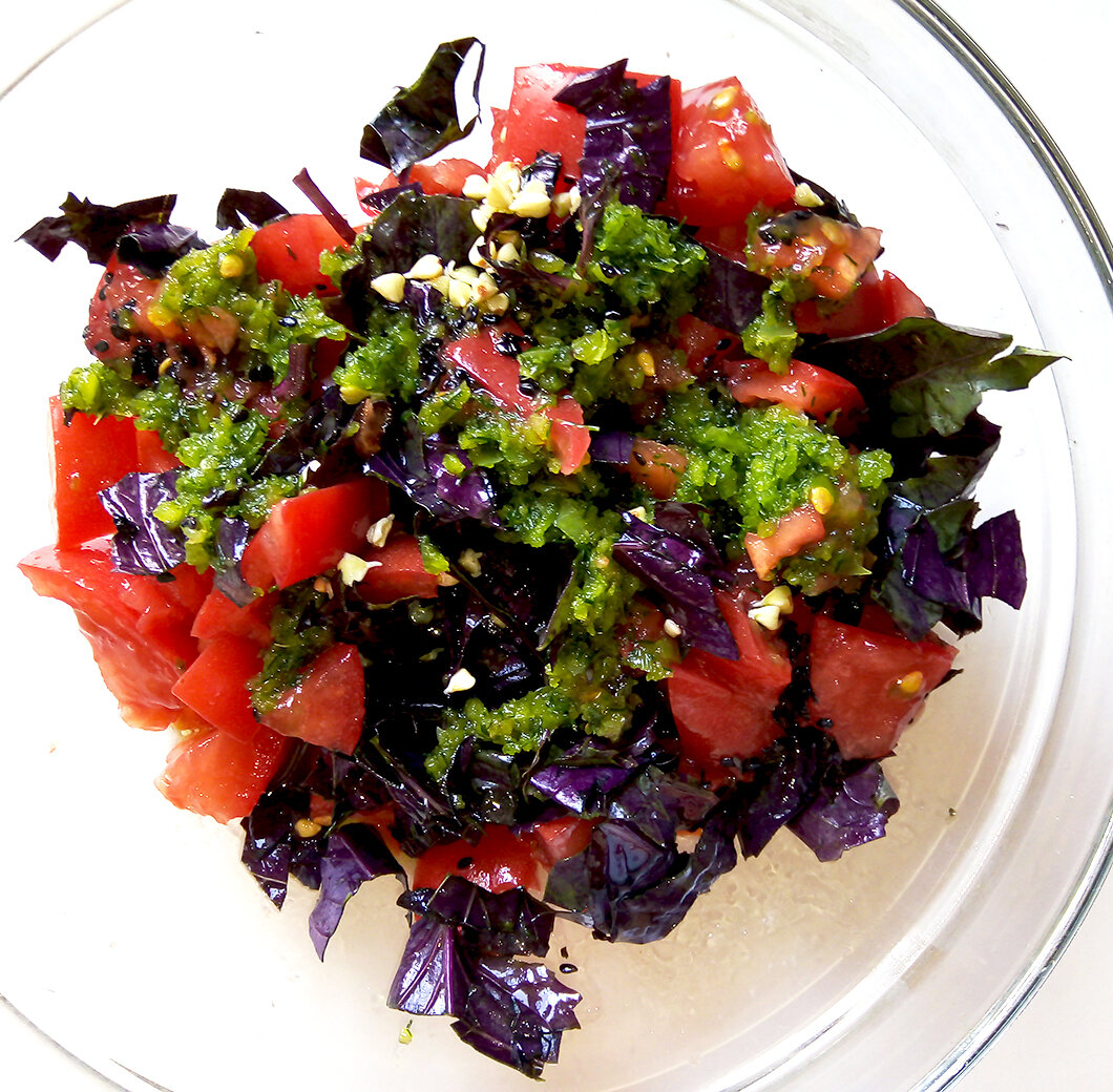 Собсно все ну очень просто, как и в большинстве салатов - просто нарезаем, заправляем маслом, солим и можно кушать).