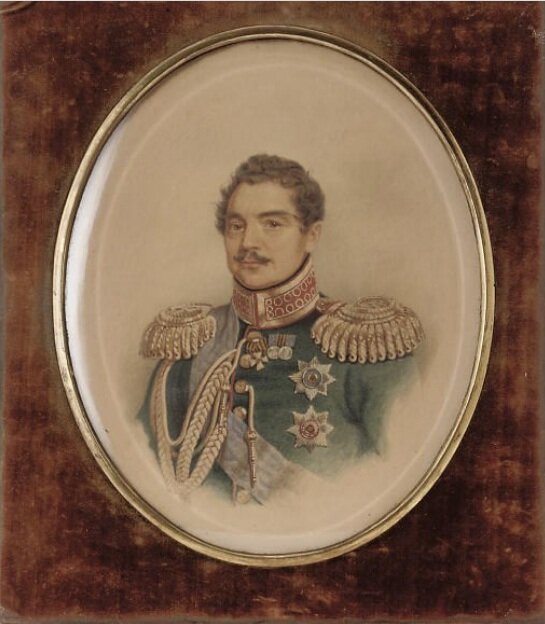 Кривая траектория судьбы занесла меня на сайт аукционного дома «Кристис», на котором среди лотов с давно прошедших аукционов обнаружилась миниатюра, приписанная экспертами аукциона «Русской школе» и атрибутированная ими как «портрет офицера гвардейского гусарского полка». Русского, конечно. В описании лота также говорится, что персонаж изображен «в синем мундире с красным шитым золотом воротником и эполетами». Атрибуция экспертов «Кристис» странным образом сочетает знание и незнание. С одной стороны они смогли совершенно верно опознать в одеянии персонажа гусарский вицмундир (что, возможно, для человека, вовсе незнакомого с историей униформы, далеко не очевидно), с другой – оказались почему-то не в курсе (если уж современное состояние миниатюры не позволяет определить это по самому изображению), что русские гусарские вицмундиры имели зеленый, а не синий цвет. Ну и не менее странно, что они не смогли идентифицировать личность изображенного. Попробуем это сделать мы. Итак, портретируемый