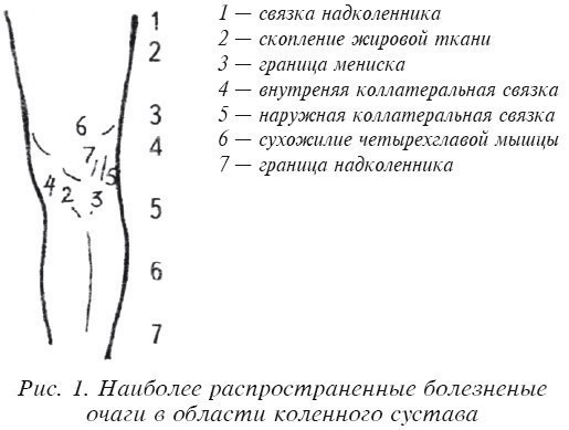 Коленный сустав имеет сложное строение, и поэтому довольно неустойчив и легко уязвим. Поскольку на него приходится вес всего тела, связки, синовальная оболочка и мениск сустава подвержены частым травмам. Наиболее распространенными патологическими отклонениями являются: сращения, тугоподвижность, ограниченность в движении и другие симптомы травматизации и дегенеративных изменений, которые могут сопровождаться шпорой на поверхности сустава и уплотнением жировой ткани. Кроме того могут наблюдаться боли и ограничение суставных движений без позитивных симптомов. Такие явления называют внутрисуставными нарушениями коленного сустава. При лечебном массаже используют, в основном, пощипывание, встряхивание, движение в суставе, а также приемы, направленные на расслабление мышц. Массаж способствует снятию воспалительных процессов в мягких тканях, приведению структуры сустава в физиологическую норму, устранению блокады суставов и восстановлению их функций. При правильном выполнении массажа отмечают