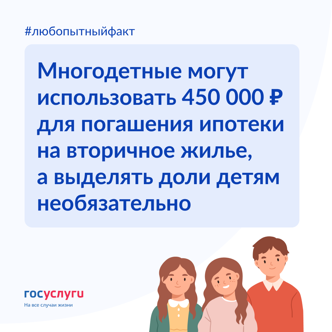 Это третий выпуск рубрики «Любопытный факт». Интересное и важное — очень коротко. Поделитесь с теми, кто не знает. Больше информации по теме 🔸 Продление программы до конца 2023 года 🔸 Мифы и правда о выплате 450 000 ₽ @gosuslugiforparents