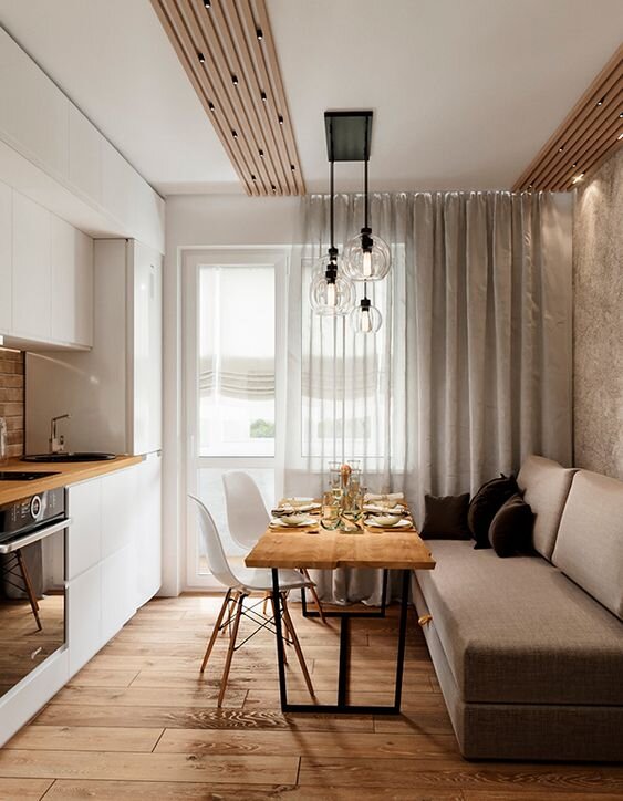 Очень часто в моей проектной деятельности попадаются запросы сделать кухню в вытянутом помещении... Но не просто кухню, а так чтобы там была еще и обеденная зона, и гостиная. Последние два моих проекта были как раз с такой кухней .. Там немного разная планировка- одна кухня проходная , другая -нет.. Но оба помещения вытянутые и с набором вышеперечисленных функций. Я выделяю два основных принципа планировки вытянутой кухни-гостиной : 1-без деления на зоны, 2-с делением на зоны. 1. Без деления на зоны. Это достаточно простое решение , не требующее деления на зоны. Кухня в таком случае располагается вдоль одной стены, или может быть угловая . Центральная свободная зона отдается обеденной группе и дивану, который как раз выполняет скромную функцию гостиной. Есть конечно минус - если вы хотите в таком варианте разместить телевизор - то тут не так много вариантов его размещения. Самый щадящий-это разместить телевизор над обеденной группой. Но смотреть его будет удобно всем сидящим за сто