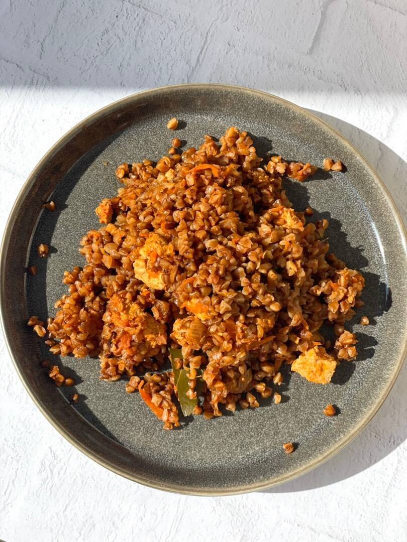 Ингредиенты: 300 г Куриное филе, 1 шт Лук, 1 шт Морковь, 2 зубчика Чеснок, 2 ст.л Томатная паста, 150 г Гречневая крупа, 2 ст.л Растительное масло, 2 шт Лавровый лист, Соль, перец Способ приготовления: Гречку промыть и просушить на смазанной маслом сковороде. Филе измельчаем в фарш. На растительном масле обжарить нарезанный лук, натертую морковь и мясной фарш до золотистого цвета. Добавить томатную пасту, хорошо перемешать. Всыпать гречку и залить кипящей водой так, чтобы она немного ее покрывала (примерно 2:1), добавить лавровый лист, посолить поперчить. Готовить под крышкой на медленном огне до впитывания жидкости. В готовую гречку добавить мелко нарезанный чеснок. Приятного аппетита ❤️. Автор: Кристина Лавриненко
