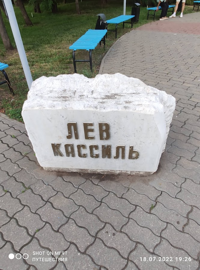 Памятник, на мой взгляд, замечательный. Кассиль изображён на нем задорным юношей с книгой Жюля Верна в руках.