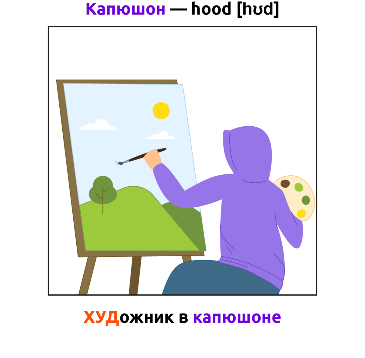 Наше воображение — лучший инструмент для запоминания информации. На образах и их соединении строится мнемотехника. С помощью ежедневных тренировок можно добиться высокой скорости запоминания — 10 иностранных слов за 5 минут. Или 100 слов за час! Примеры того, как соединять образы, вы сможете увидеть на наших специальных картинках, которые мы расположили после каждого шага. За время прочтения этой статьи вы сможете запомнить, как переводятся слова, изображенные на картинках. Сначала прочитайте все шаги, а затем вернитесь к забавным картинкам. Смотря на каждое из изображений, обязательно следуйте алгоритму. Алгоритм запоминания 100 английских слов за 7 шагов для пополнения словарного запаса без зубрёжки: Шаг 1. Подготовьте словарные пары Словарная пара — это иностранное слово и перевод. Соберите 100 пар для запоминания самостоятельно или найдите готовый список в интернете. Если не уверены в своём умении правильно читать английские слова, обязательно пропишите транскрипцию. Слово № 1 Шаг