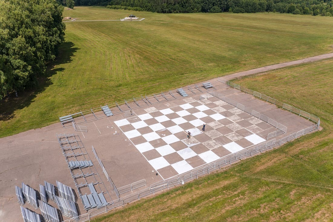 Шахматная доска приобрела яркие очертания и отлично видна с высоты птичьего полета - сверху картина совершенно потрясающая. Еще несколько дней и на поле состоится мирный шахматный поединок. На огромной шахматной доске выстроятся 32 фигуры, роль которых выполнят участники военно-исторических клубов. Обширная программа для посетителей музея-заповедника будет проходить с утра и до позднего вечера.
