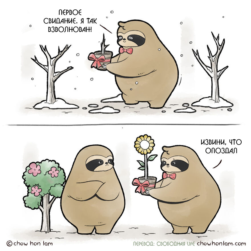 Мне очень нравятся вдохновляющие комиксы, которые просто веют добротой и искренностью! Особенно, когда в них изображены милые животные, ведь кто, как не эти создания, могут показать нам действительно важные вещи, и научить нас быть более добрыми, отзывчивыми и понимающими. Эта серия комиксов от Чоу Хон Лама называется «Беседа пухленьких животных». Истории из повседневной жизни очаровательных животных не оставят равнодушных! Художник говорит, что внешний вид и отношения персонажей были вдохновлены жизнью в период карантина. Кстати, Чоу - художник-самоучка. Он говорит, что из-за финансовых проблем у него не было возможности пойти в художественную школу. Однако он уже рисует около 20 лет! Творческий путь автор начал в небольшой дизайнерской фирме, где он работал внештатным художником. И с тех пор он продолжает учиться и совершенствоваться как художник. Раньше Чоу мечтал стать художником-комиком, однако потом эта мечта куда-то испарилась. И вот, через 20 она вернулась и постучалась в ег
