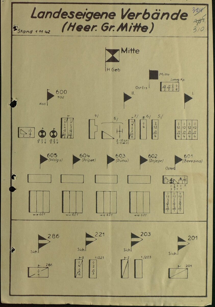 С) пять отдельных ост-батальонов: 601 «Березина» (придан 286-й охранной дивизии), 602 «Днепр» (придан 203-й охр.д.), 603 «Двина» (придан 201-й охр.д.), 604 «Припять» (придан 221-й охр.д.), 605 «Волга» (придан 286-й охр.д.).