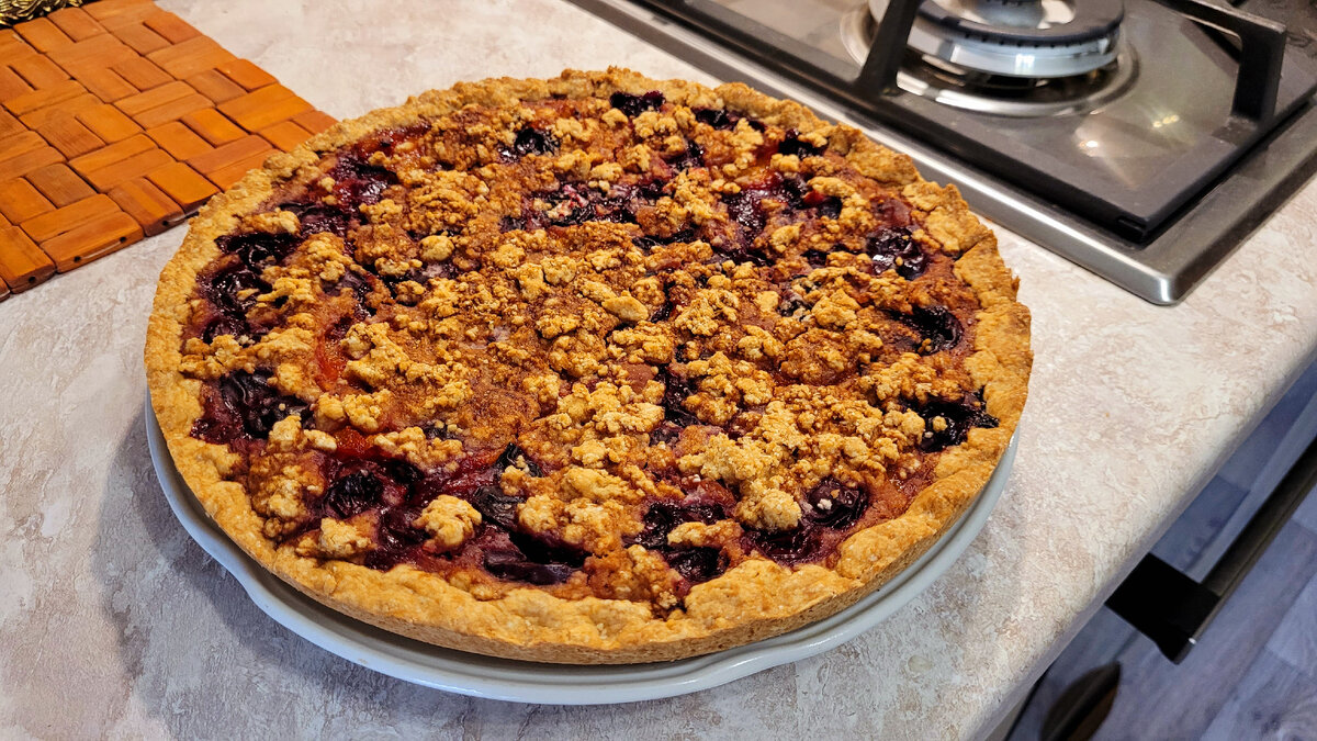 Для теста нам понадобится: Мука - 280 гр. Сахар - 80 гр. Ванилин - 1 ч.л. Разрыхлитель - 1 ч.л. Соль - на кончике ножа. Яйцо - 1 шт. Сливочное масло (предварительно замороженное) - 100 гр. Для начинки нам понадобится: Вишня и абрикосы - 450 гр. Сахар - 90 гр. Крахмал кукурузный - 2 - 2,5 ст.л. (без горки). 1. В миску с мукой отправляем соль, разрыхлитель, ванилин. 2. На мелкой тёрке натираем сливочное масло. Натираем в миску с мукой, постоянно перемешивая натертое масло с мукой, чтобы образовалась крошка. 3. В отдельной миске смешиваем яйцо и сахар. Мешаем до растворения сахара (взбивать не надо). 4. Вливаем яйцо в миску с мукой. Руками мешаем всю массу. Аккуратно, чтобы тесто напоминало крошку. Мять тесто не нужно. 5. 2/3 теста отправляем в предварительно смазанную маслом форму для выпекания. Распределяем тесто по дну и стенкам формы. 6. Готовим начинку: в миске смешиваем вишню без косточек и кусочки абрикосов, добавляем сахар и крахмал. Всё хорошенько промешиваем. 7. Заливаем