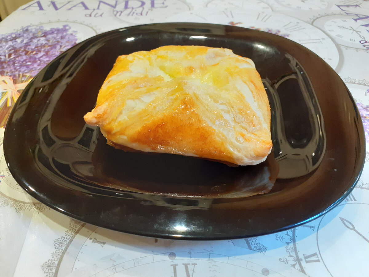 Какое-то время назад я купила слоеное дрожжевое тесто. Зачем? Не помню. Видимо что-то хотела сделать. Но, в тот раз, не склалось. Отправила упаковку в морозильник. И вот, обнаружила её при ревизии содержимого холодильника. Встал вопрос: что делать? Приняла решение: сделать булочки. Для начала тесто необходимо разморозить. На это ушло минут 40. Взяла яйцо, разделила его на желток и белок. Ветчину и сыр потерла на терке. Добавила яичный белок. Зачем это нужно? Давным-давно я прочитала, что если к сырной начинке добавить белок, он свяжет сыр и не даст ему вытечь при приготовлении. Тесто я разделила на четыре части и каждую из них раскатала. Хотя, слоеное тесто обычно не раскатывают, что-бы не нарушить слоистость. Но мне слоистость была не нужна. На каждую из лепёшек положила смесь из ветчины и сыра. Теперь каждое будущее кулинарное изделие надо тщательно защипать. Решила провести эксперимент. Желтком помазала поверхность трёх булочек. Одну же оставила без желтка. Как потом выяснилось, эта