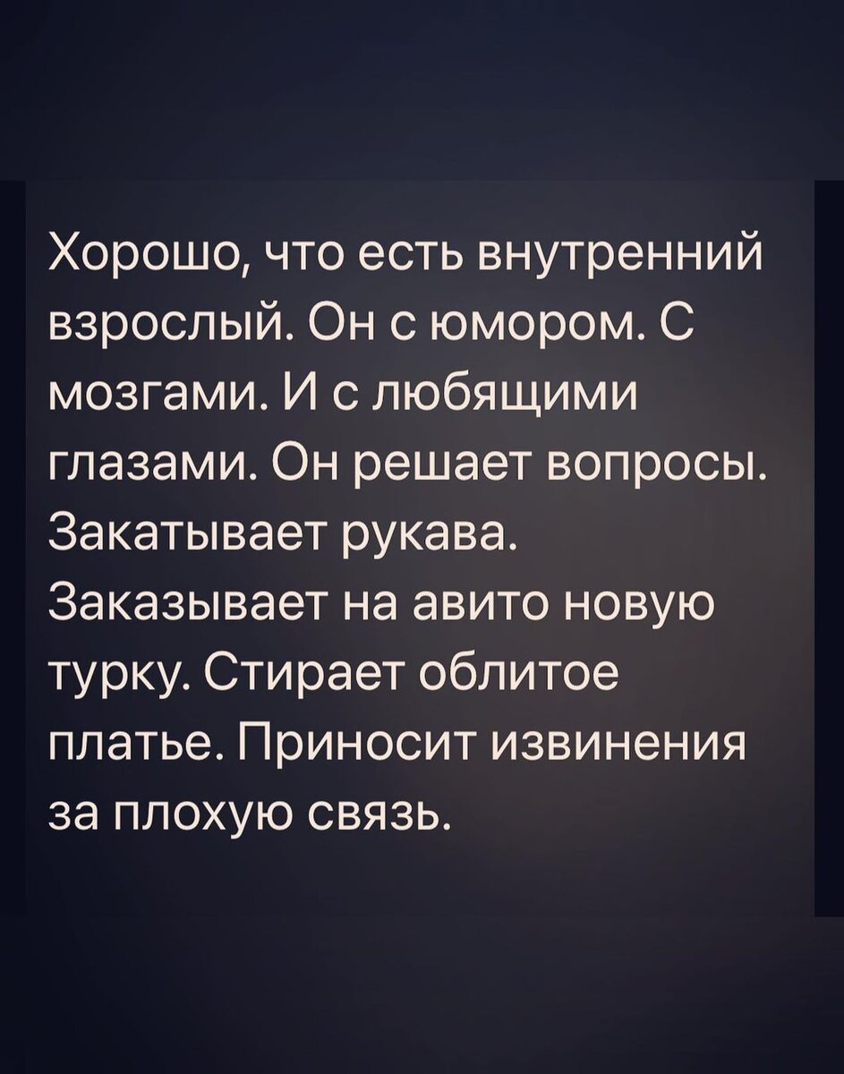 Сначала кот решил петь серенады в 4 утра. Потом я пошла варить кофе в любимой хрустальной турке. Подвинула кастрюлю, с нее соскользнула крышка и метким ударом расколола турку. Потом я облилась кофе, быстро переоделась и пошла на работу- преподавать он-лайн. Я это почти каждый день делаю, но именно тут отказали все мыслимые интернеты и ссылки. В поисках поддержки я залезла в банку ресурсов, подаренную друзьями и вытащила оттуда… вот такой стишок: ⠀ я год служил на космодроме и лично видел как летит ракета стартовав внезапно под общий возглас БЛЯТЬ КУДА ⠀ Тут все стало окончательно ясно. Кажется, наступил именно он, день-пizдень! Сопротивление бесполезно. Ну что ж. Хотела Таня писать полезный контент? Вот на своем опыте и пиши. ⠀ Как проживать такие моменты? ⠀ Вспомнилась ролевая модель ВЗРОСЛЫЙ-РОДИТЕЛЬ-РЕБЕНОК. Ребенок искренне расстраивается, проживает горе от потери турки, стыд от плохого интернета и ноет в сториз, просит поддержки типа: поставьте сердечко и вообще всячески себя жал