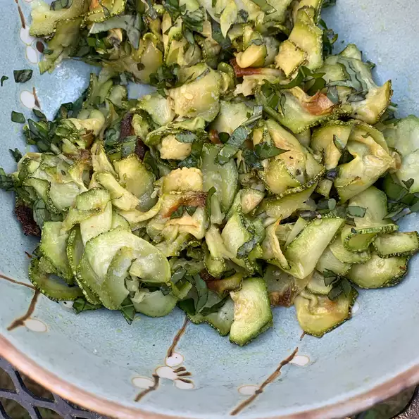 - Запекайте в предварительно разогретой духовке, пока цуккини не станут мягкими и слегка подрумянятся по краям (около 20 минут).