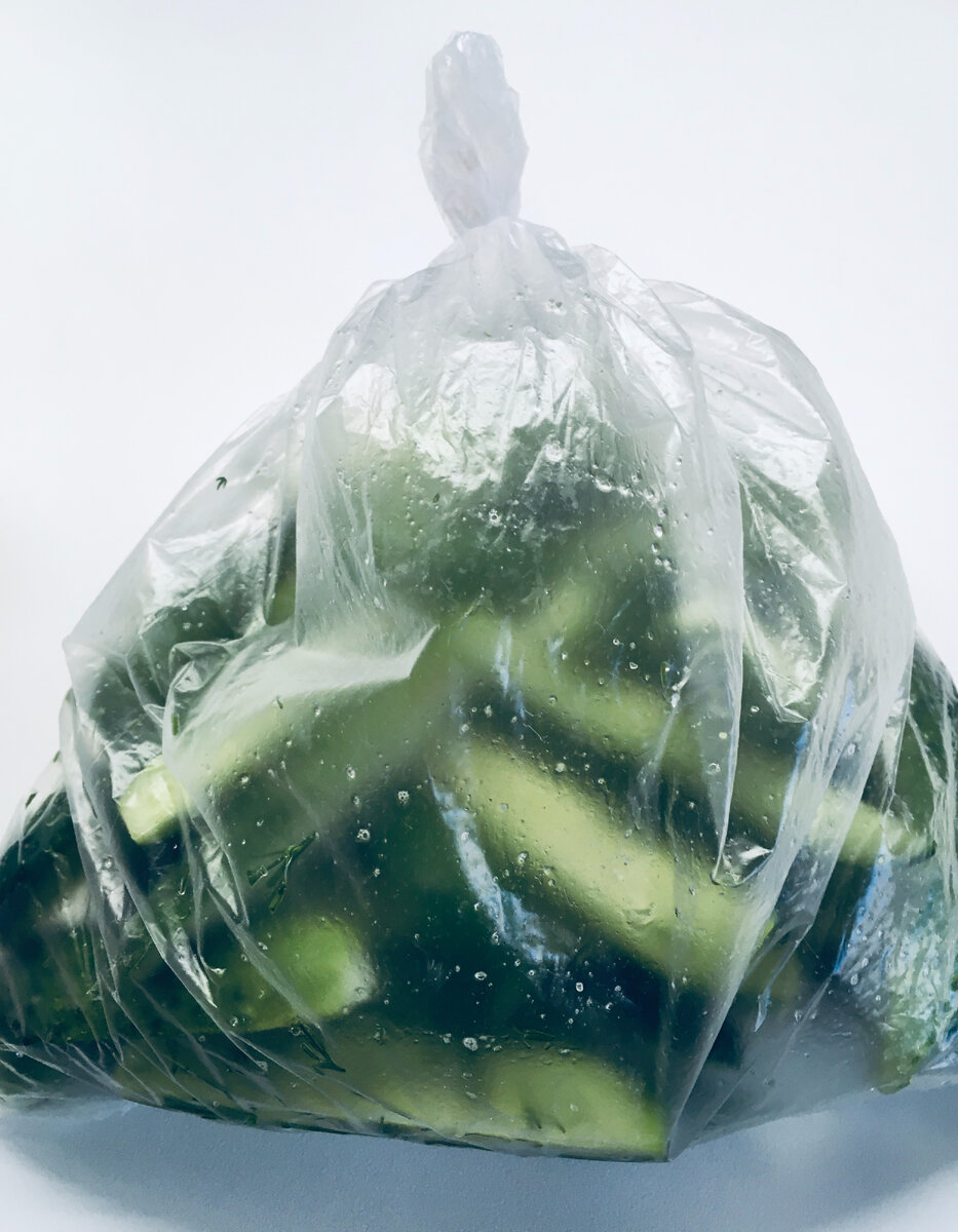 Малосольные огурцы в семье ем только я и готовить их в банке с рассолом мне было лень, а таким способом я делаю себе немного и в холодильнике занимают мало места. Ингредиенты: 1 кг. – огурцы 1 ст. л – соль 1 ч.л. – сахар 3 -4 зубчика чеснока 1 пучок – укроп Способ приготовления: 1. У огурцов обрезать кончики. Можно огурцы оставить целыми, можно разрезать вдоль пополам или вдоль на 4 части. Чем меньше нарезка, тем быстрей огурцы просолятся, но если огурцы будут целыми они более твердые и хрустящие получаются 2. В пакет (можно использовать контейнер) выложить нарезанный чеснок и укроп, сверху огурцы, соль и сахар. Пакет (контейнер) не заполнять “под завязку” должно остаться свободное место. 3. Пакет завязать так, чтобы в нем остался воздух (контейнер закрыть крышкой) 4. Все хорошо потрясти, чтобы соль и пряности равномерно распределились. 5. Вложить во второй пакет и убрать в холодильник 6. Если сделать утром к вечеру будет готово, но в течении дня надо пару раз потрясти содержимое п
