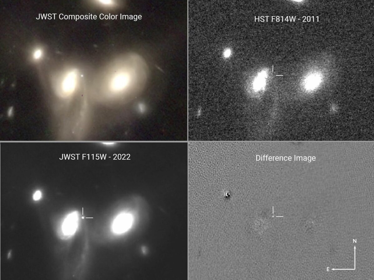 Обнаруженный транзиент отсутствует на снимках за 2011 год и находится в галактике, свет от которой шел до нас 3,2 миллиарда лет. Группа астрономов во главе с Майком Энгессером из Института исследований космоса с помощью космического телескопа сообщила об открытии первого кандидата на роль вспышки сверхновой, найденного при помощи «Джеймса Уэбба». Транзиент был найден при сравнении снимков неба, полученных прибором NIRCam «Джеймса Уэбба» в ближнем инфракрасном диапазоне, и архивных изображений камеры ACS космического телескопа «Хаббл» — его не было на снимках в 2011 году, однако источник излучения есть на снимках, полученных летом 2022 года. Обнаруженный точечный источник излучения находится в галактике SDSS J141930.11+525159.3, для которой значение красного смещения z=0,284, что означает, что свет от вспышки шел до Земли около 3,29 миллиардов лет. Абсолютная звездная величина транзиента оценивается от -15,5 до -16. Ученые считают, что этот транзиент может быть вспышкой сверхновой, у