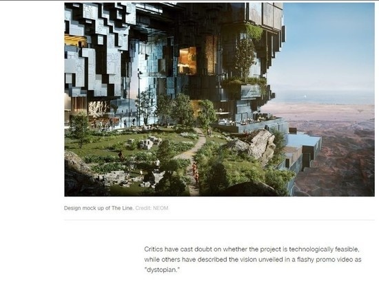 Саудовская Аравия представила проекты своего амбициозного городского проекта «Линия». Он представляет собой город с одним зданием в пустыне, который будет простираться на 170 км и в конечном итоге будет вмещать 9 миллионов человек. Согласно заявлению наследного принца королевства Мохаммеда бин Салмана, часть проекта Неом, грандиозного плана, который будет завершен спустя годы, предлагаемый футуристический город будет расположен на северо-западе страны Персидского залива, недалеко от Красного моря. Линия представляет собой предлагаемое здание шириной 200 метров. действующее как вертикальный город, спроектированный так, чтобы располагаться на высоте 500 метров над уровнем моря. Согласно пресс-релизу, его площадь составит 34 квадратных километра Хотя подробностей мало, те, кто стоит за дизайном, утверждают, что The Line будет полностью работать на возобновляемых источниках энергии, без дорог, автомобилей и вредных выбросов. Высокоскоростная железная дорога соединит участки линии, добавляе