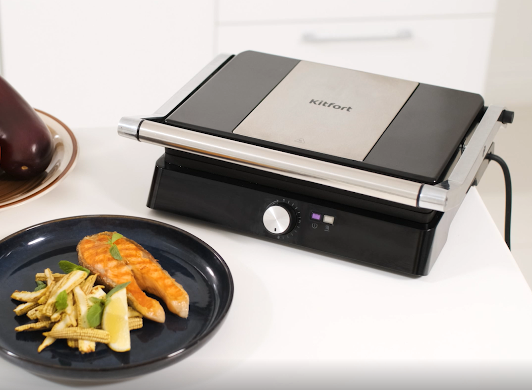Этот особенный вкус блюд, приготовленных на гриле...Летом вы можете поехать на природу, захватив мангал или...приготовить такой ужин в любое время года прямо у вас на кухне с помощью электрогриля Kitfort KT-1662! Многофункциональный помощник Электрогриль КТ-1662 предназначен для приготовления мяса, рыбы, овощей, сосисок, бутербродов, сэндвичей, гренок и даже тостов! Высокая температура способствует быстрому приготовлению продуктов, а ребристая поверхность – появлению на них характерного «полосатого» рисунка, который прибавляет блюду ещё больше аппетитности. Благодаря обжариванию продукта с обоих сторон появляется корочка, а внутри он остаётся сочным и нежным. Режим барбекю В одностороннем режиме крышка электрогриля откидывается на 180° и гриль превращается в большую жаровню. Продукты можно выложить сразу на две панели,так, что получится пожарить одновременно и овощи, и мясо. Для раскладывания гриля предусмотрена специальная кнопка на боковой части корпуса. Мощный и быстрый нагрев Конс