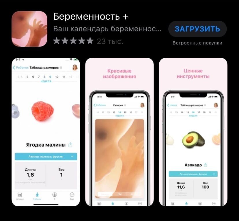 Приложения для беременных – современный и удобный способ контроля над состоянием здоровья будущей мамы и ребенка. Они удобны, практичны и не занимают много места на телефоне. Кроме того, они дают рекомендации по питанию, список необходимых на первое время после родов вещей, расширяют кругозор и вносят немного организованности в этот непростой для каждой женщины период. Через приложения можно изучать новости и современные исследования по внутриутробному развитию человека. «Гуранка» подготовила топ лучших приложений для беременных в 2022 году. Беременность + Русскоязычная программа для беременных на iphone и android c большим количеством положительных отзывов в Сети. В приложении рассматриваются темы: лучшее время для зачатия; признаки здорового внутриутробного развития; анализы и обследования; что такое счетчик схваток; список необходимых покупок; 1000 имен для малышей; советы для мам и других членов семьи до и после родов. Информация подается интересно и сжато, без лирических отступлен