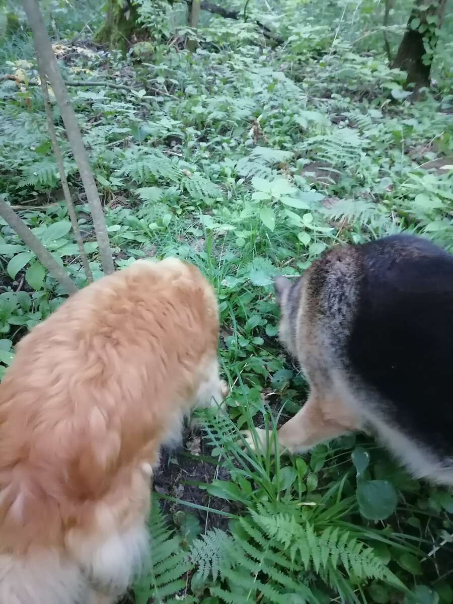 Я уже писала, что моя Гердочка, хоть и полновата, и ходит медленно, но охотница по духу. И откуда что берется?! Пошли мы на прогулку в лес. У Фреда лишь палки на уме. А Герда смотрит, нюхает по сторонам, от меня почти не отходит. И вдруг в момент - ушки торчком, и словно белка как прыгнет! Нет, не прыгнула - взлетела! И откуда такая легкость берется. В общем, пара прыжков, и кошка еле успела сообразить в чем дело и убежать! А тут Фред встрепенулся, и ведь не учили его - кинулся наперерез. В общем, кусты трещат, хвосты мелькают. Кошку спасла дырка под забором, который отгораживает территорию СНТ от леса - шмыгнула. Я тихонько выдохнула, что не пришлось ругаться и отбивать животинку у охотничков. Но как они возбудились то! Языки висят, хвостами виляют, блеск в глазах! Довольные! Поохотились. И ага, спелись ведь! Команда! В общем, глаз да глаз за ними. Охотнички. На вкусняху охотничкам: