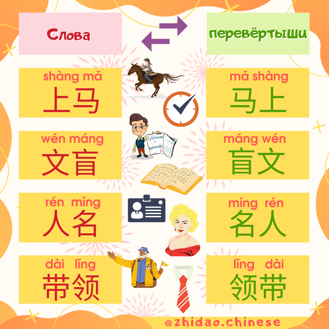 #zhidao_синонимы Сегодня мы еще раз разбавим нашу подборку словами-перевертышами! Если в таких двусложных словах поменять иероглифы местами, то получится новое слово, смысл которого может разительно отличаться 🔁 🔊 Открывайте видео и включайте звук, чтобы услышать, как произносится каждое слово! 🏇 上马 shàngmǎ садиться на лошадь ⏳ 马上 mǎshàng скоро, вот-вот 🙉 文盲 wénmáng неграмотный, неграмотность 👨🦯 盲文 mángwén шрифт Брайля 💳 人名 rénmíng имя человека 💃 名人 míngrén известный человек, знаменитость 🙋 带领 dàilǐng вести, возглавлять, руководить 👔 领带 lǐngdài галстук 📝 Ссылка на карточки Quizlet для изучения новых слов: https://quizlet.com/_bsmvjj?x=1qqt&i=2r5snr 📚 Хотите, чтобы Вы или Ваш ребенок заговорили на китайском? Напишите нам для записи на групповые / индивидуальные занятия! 🎓 #china #chinese #школакитайского #китайский #москва #язык #китайскиймосква #учукитайский