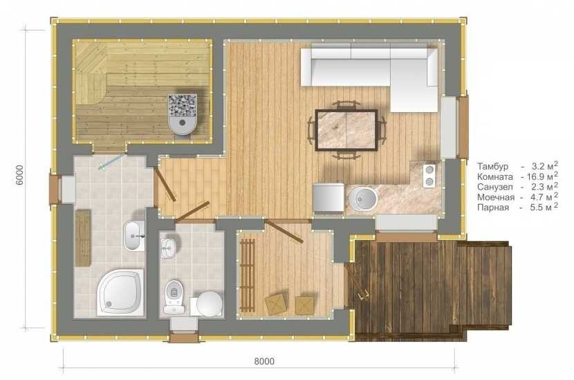Первым этапом строительства бани является подготовка проекта. Проект должен включать расчётное количество строительных материалов, а также размеры всей бани и помещений в ней: На плане нужно отметить место, где будет находиться печь. В проекте печка должна располагаться таким образом, чтобы уменьшить теплопотери (обычно в центральной части помещения, с учётом специальной термозащиты). Можно составить проект самому или воспользоваться помощью профессионалов. Что нужно учесть при проектировке бани? 1. Площадь бани. Рассчитывается с учётом закладываемого бюджета, а также количества человек, которые будут отдыхать. 2. План помещений и подводка коммуникаций. 3. Вид печи. Стандартная дровяная печь, электрическая (хотя тут нужно учитывать расход электроэнергии, что часто обходится недёшево), газовая. Кстати, под печь требуется отдельный фундамент (мин – 10 см). Блоки или монолитные арболитовые плиты? Из-за меньшего количества мостиков холода, монолитные арболитовые плиты будут более предпочти