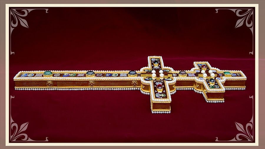 - У этого креста очень богатая история. Он, как и многие напрестольные кресты, является произведением ювелирного искусства. Крест изготовлен из благородных металлов и украшен драгоценными камнями. В нём помещены частицы мощей православных святых. В миру данный крест известен как крест Евфросинии Полоцкой. Этот напрестольный крест был изготовлен для церкви Святого Спаса в городе Полоцке по заказу Евфросинии полоцким мастером Лазарем Богшей в 1161 году.