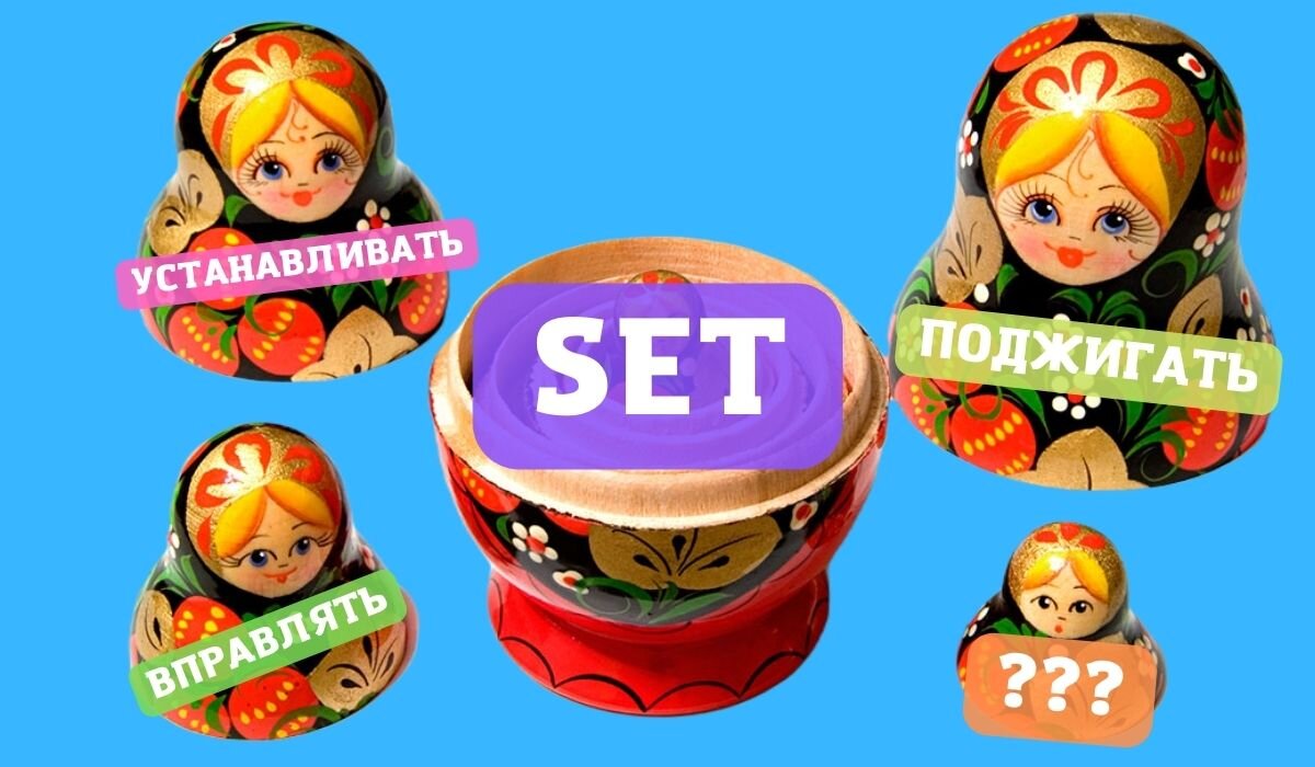 Сегодня речь пойдёт о втором глаголе из цикла "МНОГОГРАННЫЕ ГЛАГОЛЫ АНГЛИЙСКОГО ЯЗЫКА" - многоликом глаголе SET. Для тех, кто пропустил мою статью про глагол GET, можете ознакомиться с ней после прочтения текущей. Основное значение глагола "SET" - "класть/положить". Однако в современном английском вместо него чаще используют глагол "PUT". Несмотря на это, глагол SET остается актуальным во многих устойчивых выражениях. SET THE TABLE - НАКРЫТЬ (расставить по местам) Set the table - Накрыть стол SET = ВПРАВЛЯТЬ "A doctor sets a bone/fracture. - Доктор вправляет кость/вывих." SET = ПОМЕЩАТЬ/ОПРАВЛЯТЬ (по отношению к ювелирным изделиям) "Diamonds sets in the bands - Бриллиант оправлен золотом (помещен в золотую оправу)" SET = ПРИВОДИТЬ В КАКОЕ-ТО СОСТОЯНИЕ Самыми распространенными примерами использования SET в этом значении, это фразы: SET SOMETHING TO FIRE - ПОДЖИГАТЬ ЧТО-ТО SET SOMEONE/SOMETHING FREE - ОСВОБОЖДАТЬ КОГО-ТО/ЧТО-ТО SET SOMETHING IN MOTION - ПРИВОДИТЬ ЧТО-ТО В ДВИЖЕНИЕ SET =