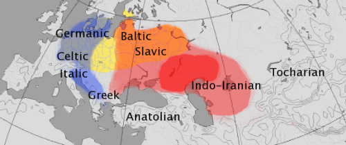 Среди учёных существуют разногласия относительно географической прародины прото-индоевропейского языка. Одни исследователи сегодня считают прародиной пра-индо-европейского языка Причерноморские степи, находящиеся к северу от Чёрного и Каспийского морей, где около 4000 года до н.э. жили народы, возводившие курганы. Другие учёные (Колин Ренфрю) считают, что прародина прото-индоевропейского языка – это территория древней Анатолии и датируют его происхождение несколькими тысячелетиями раньше.