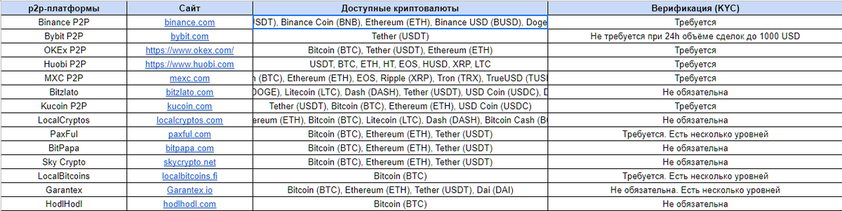 Здесь собран список бирж идеально подходящих для P2P. Пока не создано идеального решения, подходящего под все задачи и удовлетворяющего все запросы инвесторов, однако есть список проверенных бирж, среди которых вы можете найти подходящую. В таблице расписаны валюты и информация о верификации на каждой бирже Следите за нашим телеграм каналом в шапке профиля, также подписывайтесь на ВКонтакте. Всем спасибо!