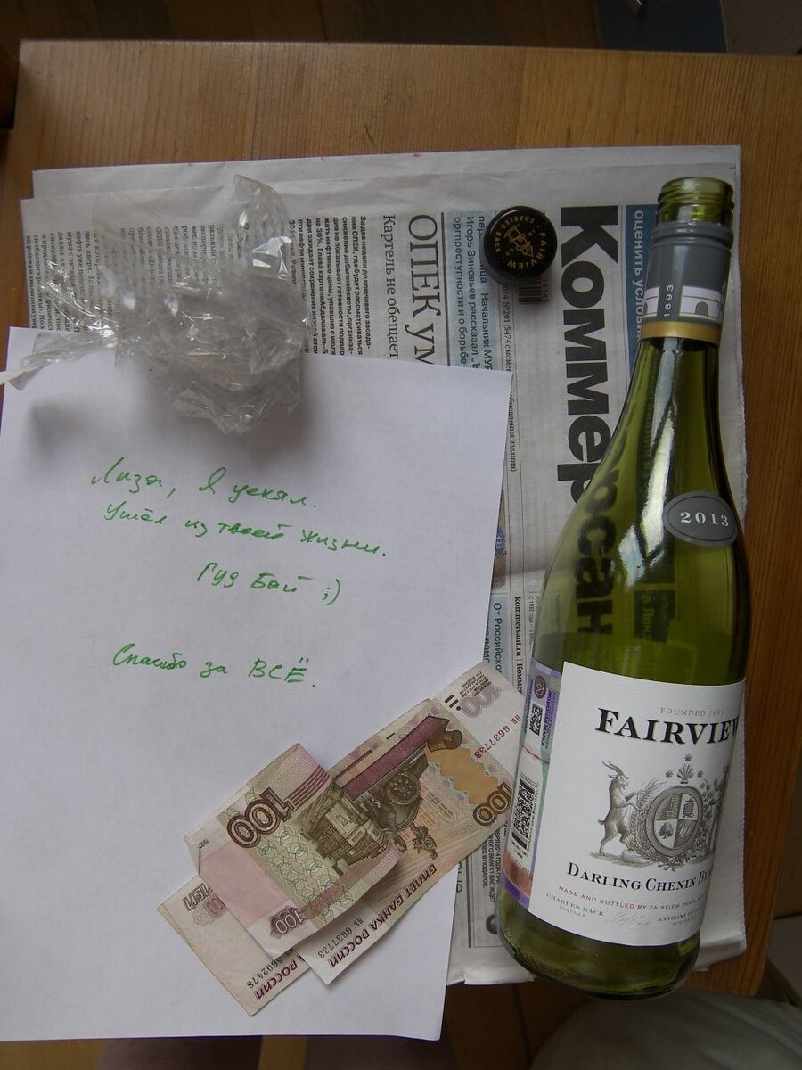 Что до вина: конкретно это, на фото, мы выпили вместе. У меня было хобби — сохранять тару от удачного вина, с которыми связаны приятные воспоминания. Ну а деньги — долг за свинину. Я один раз скинула на ужин чуть больше.