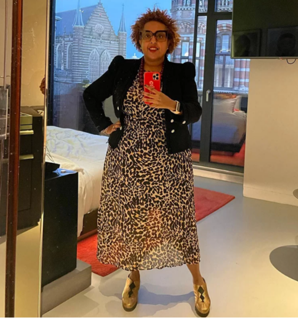 Выше еще один образ от Лидии @birabiro, которая показывает, как женщины с фигурой «яблоко» могут выглядеть великолепно в платье с принтом и блейзере.