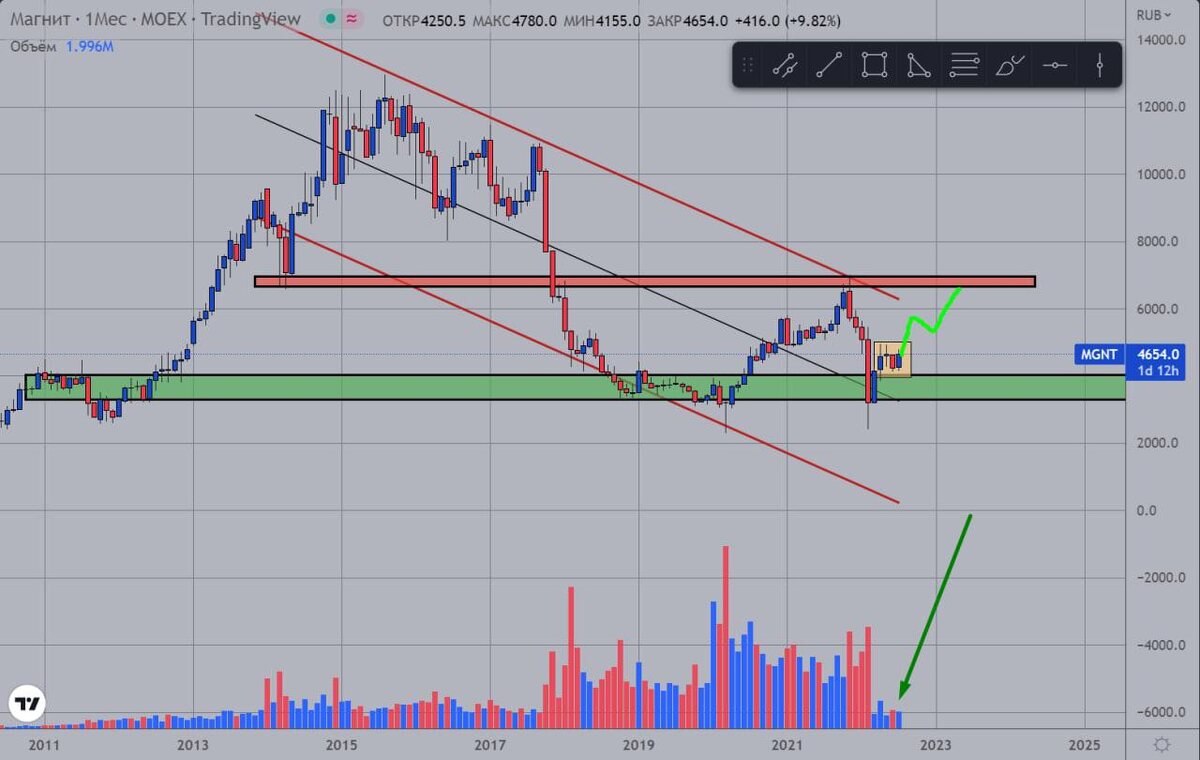 На графике Магнита сложилась маленькая, но очень классическая модель - пробой уровня + возврат к нему + ретест на объемах (отмечено желтым). Есть и другие модели говорящие о признаках разворота. ❗️Жду, что цена дорастет до диапазона 5500-6000 (потенциал примерно +20-30%), где встретит сопротивление - верхнюю границу канала. Дальше нужно будет оценить обстановку заново. Но хорошая последняя отчетность Магнита позволяет предположить, что нисходящий тренд (канал) будет таки сломлен и тогда будет маленький туземун 🚀 😏Но о влажных мечтах пока не будем… #MGNT