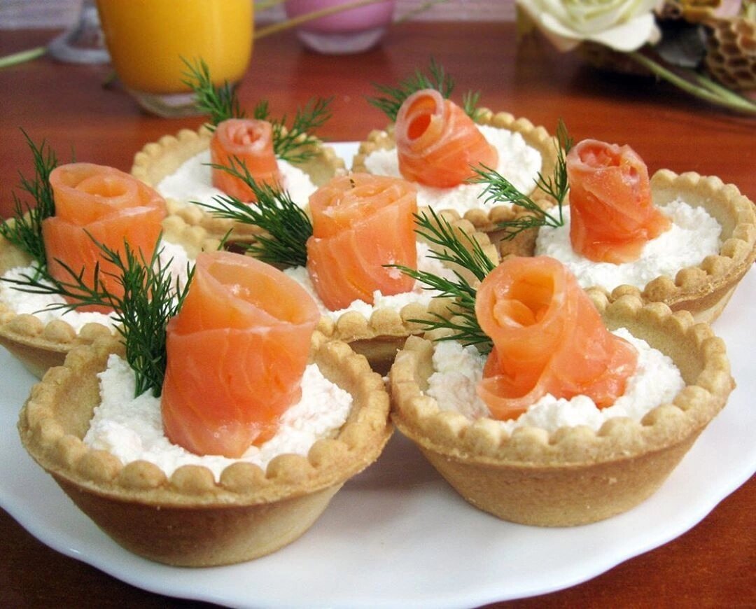 Всё соединить, добавить майонез, выложить на тарталетки, украсить кусочками рыбки и зеленью по вашему желанию
