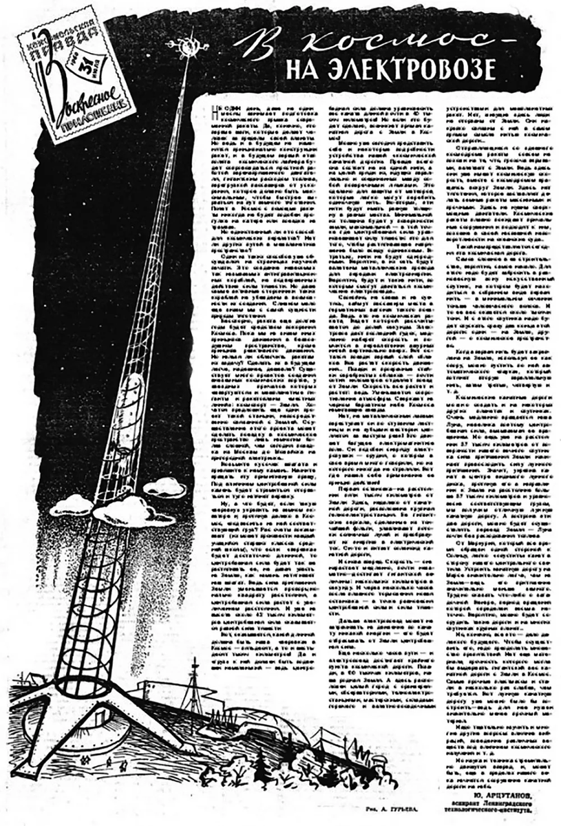 Юрий Арцутанов в 1960 году написал статью «В Космос — на электровозе», где обсудил концепцию космического лифта как экономически выгодного, безопасного и удобного способа доступа к орбите для облегчения освоения космоса.