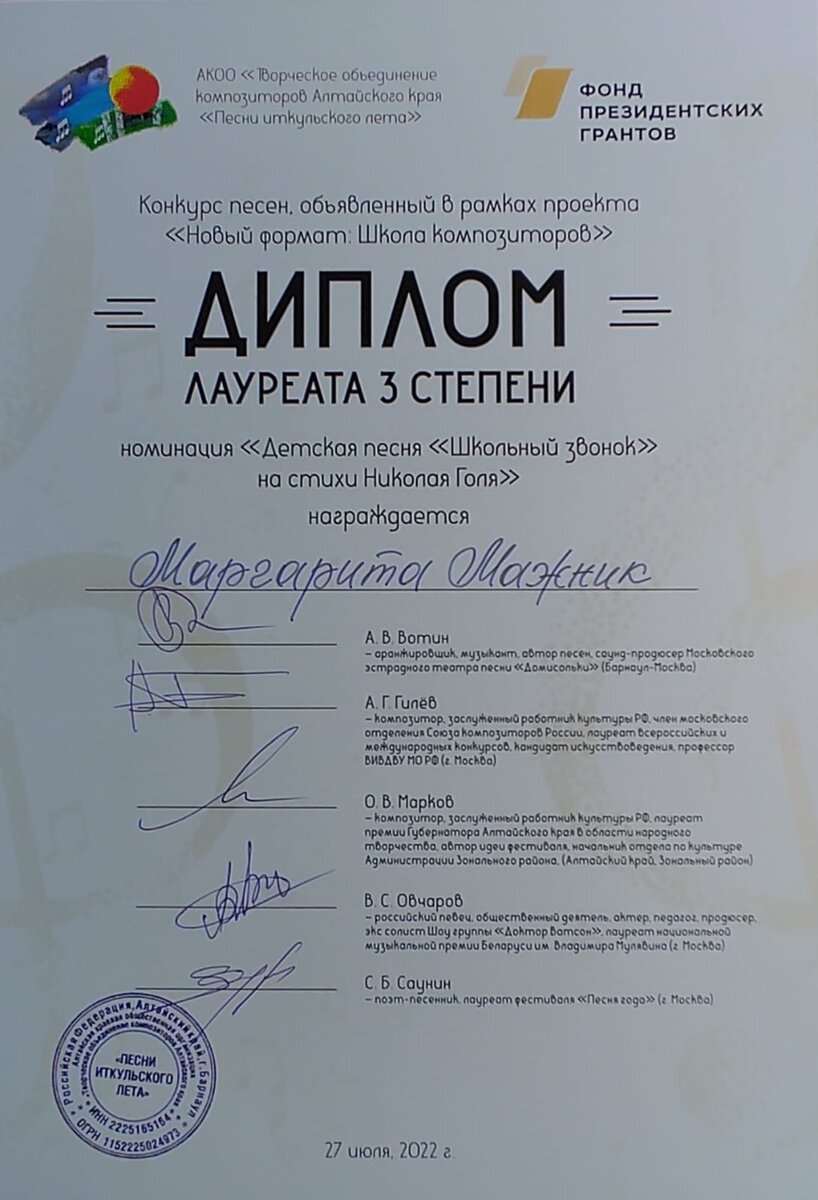 27 июля 2022 года я впервые получила Диплом лауреата 3 степени в номинации «Детская песня «Школьный звонок» на стихи Николая Голя». Для меня это было полной и очень приятной неожиданностью. – Вот это да! – обрадовалась я… – Это тебе «не хухры-мухры», – и полезла в словарь, чтобы посмотреть, что означает слова ЛАУРЕАТ. Оказалось, что слово лауреат происходит от латинского слова laureates, что переводится как «увенчанный лавровым венком». – Как прекрасно звучит перевод! – подумала я. – Но у меня ещё не венок, а так, маленький веночек. Ведь есть ещё звание «Победитель»… И теперь, поверив себя, я решила, что буду участвовать и в следующем году. Хочу выразить огромную благодарность организаторам проекта за их труд и помощь самодеятельным композиторам в их творческом развитии. Пожелать им здоровья, успехов и больших побед на выбранном пути! От всей души поздравляю начинающих композиторов и уже бывалых мэтров с получением Дипломов Победителей и Лауреатов в столь грандиозном, уникальном, вели