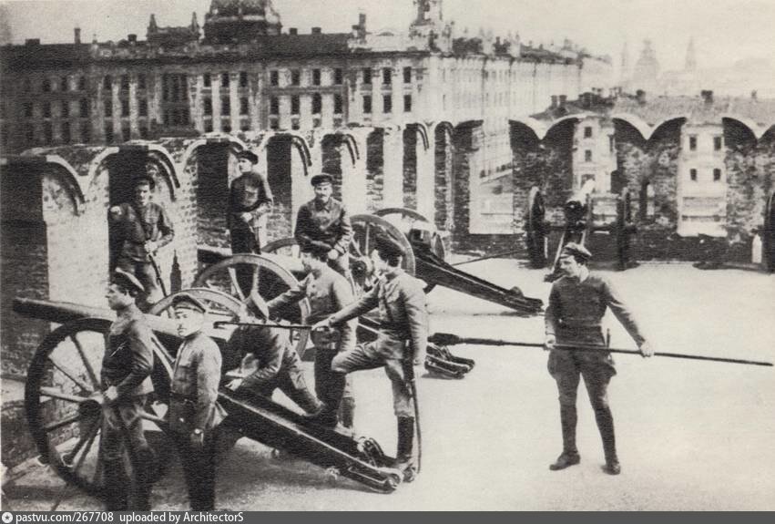 Это продолжение публикации про перенос столицы в Москву. Давайте просто прогуляемся по старому городу: Кремль и правительство охраняли латышские стрелки. Почему латышские? К новой власти, если и не были лояльны, то относились нейтрально, родственников в центральной России не имели, языка почти не понимали, договориться с ними или подкупить в этой связи было более проблематично, а в случае чего огонь открывать по чужим говорящим на другом языке людям им было бы проще. Везде появилась новая агитация: По плану монументальной пропаганды памятники «царям и их слугам» сносились и ставились памятники революционерам: Снос памятника Александру III рядом с Храмом Христа Спасителя Демонтаж памятника Александру II в Кремле Абсолютное большинство ранних советских памятников не дожило даже до войны. Часто они делались на скорую руку и либо сами разрушались, либо их демонтировали позже в связи с полным отсутствием художественной ценности: Наверное, самый удивительный и неоднозначный памятник в стиле