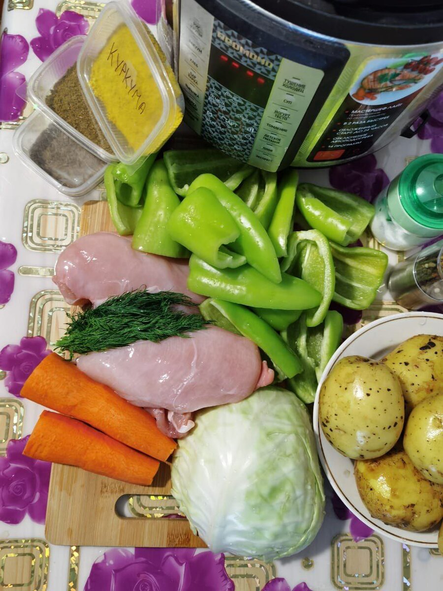 Любимые специи (я добавила тмин, куркуму, зиру) На дно чаши мультиварки выливаем 3 ст. л. подсолнечного масла, жарим курицу, нарезанную кубиками, до небольшой румяности. Все остальные ингредиенты тоже нарезаем кубиками; капусту можно нарезать соломкой. Выкладываем овощи к мясу, перемешиваем и заливаем необходимым кол-вом воды: она должна покрыть мясо и овощи полностью. Добавляем соль, перец, специи, приправляем нашинкованным укропом и готовим на режиме "тушение". Когда программа закончится, даём постоять минут 5 и выкладываем на тарелки. Приятного аппетита!