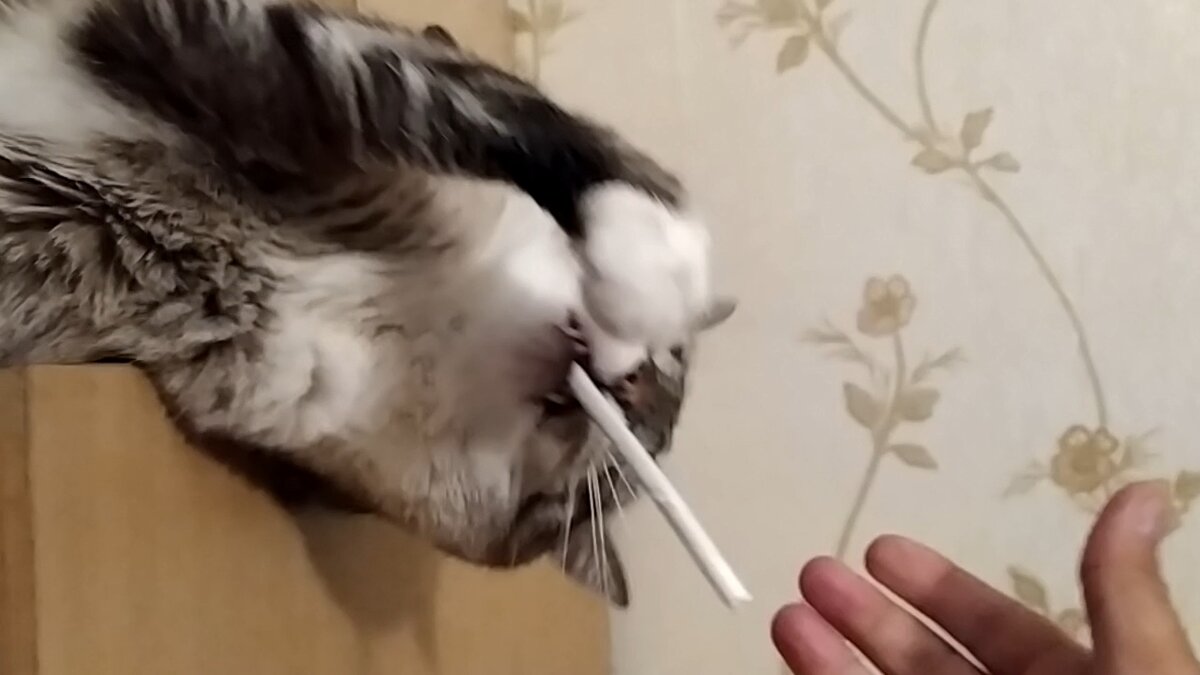Я решил подразнить валявшегося на шкафе кота Беляшика папироской. В былые годы он резко подрывался. Оказалось, что навык кот не утерял, не смотря на свою кажущуюся вальяжность и степенность. Белка дважды успел куснуть папироску и пожевать табачку. Как в молодости.