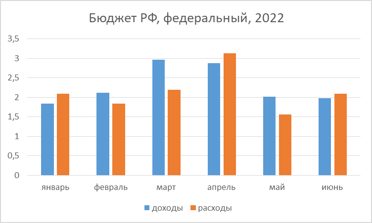 Некоторые показатели, например, расходы бюджета в разрезе отдельных статей, или консолидированный бюджет сейчас не публикуют (или публикуют, но в непривычных для меня местах). Однако по общим доходам и расходам информация есть (от минфина). Динамика в целом выглядит так (если вычислить по кумулятивным данным помесячные). С одной стороны, не так уж и плохо, в прошлом году месяцы с дефицитом тоже были. Но в прошлом году и цена на нефть была существенно меньше, соответственно, и нефтегазовые доходы. Например, сумма налога на добычу полезных ископаемых за январь-май 2022-го вдвое выше, чем за аналогичный период 2021-го. В целом они составили около 5 трлн руб из 12 трлн общих доходов, а ведь есть ещё и пошлины за нефть и газ. Из 14 трлн доходов за полгода нефтегазовые составили 6,4 по данным минфина. Максимальной доля была в апреле (о чём писал Коммерсантъ). Сравним наконец доходы и расходы в этом и прошлом году помесячно. Доходы, как мы видим, выросли сильно (спасибо подорожавшей нефти), н